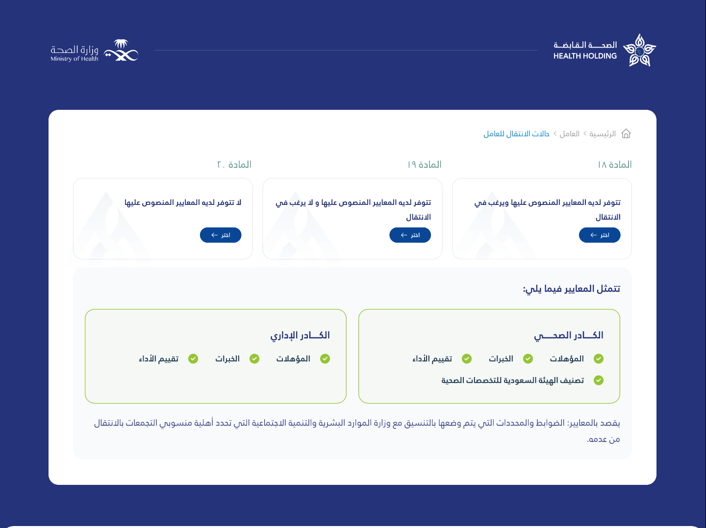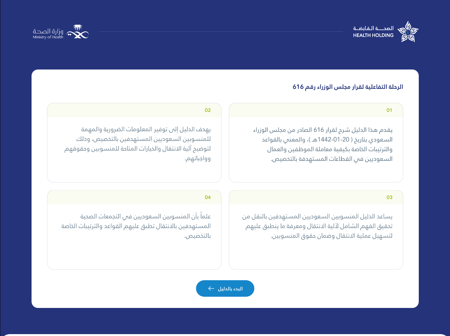 تعزيزاً للشفافية وتسهيلاً لفهم القرارات التنظيمية الكبرى، تعاون فريق Vista مع شريكنا “شركة الصحة القابضة” لتطوير واجهة رقمية تفاعلية تستعرض تفاصيل رحلة التحول المرتبطة بقرار مجلس الوزراء رقم 616 بأسلوب بصري ومبسط.